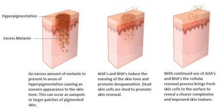 AHA’s exfoliate the skin by attacking the glue that holds the skin cells together. By doing this it makes for an even resurfacing of new skin.